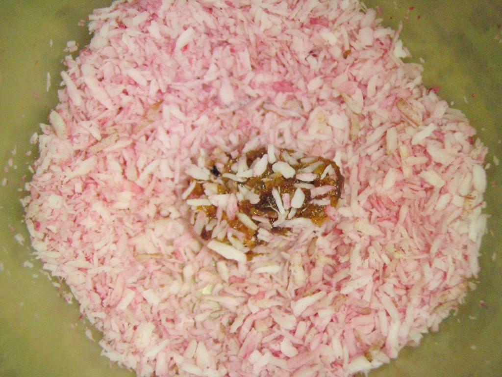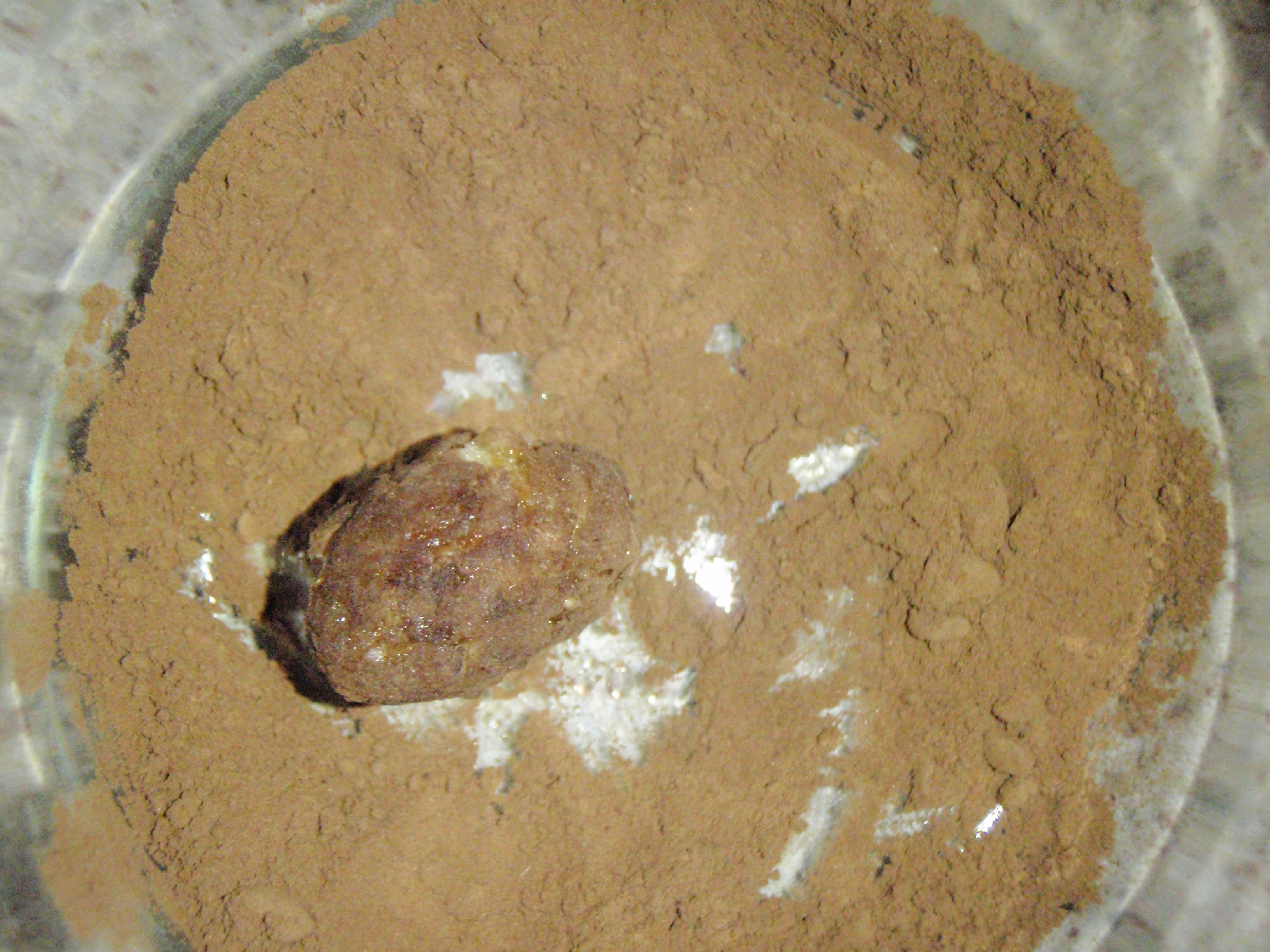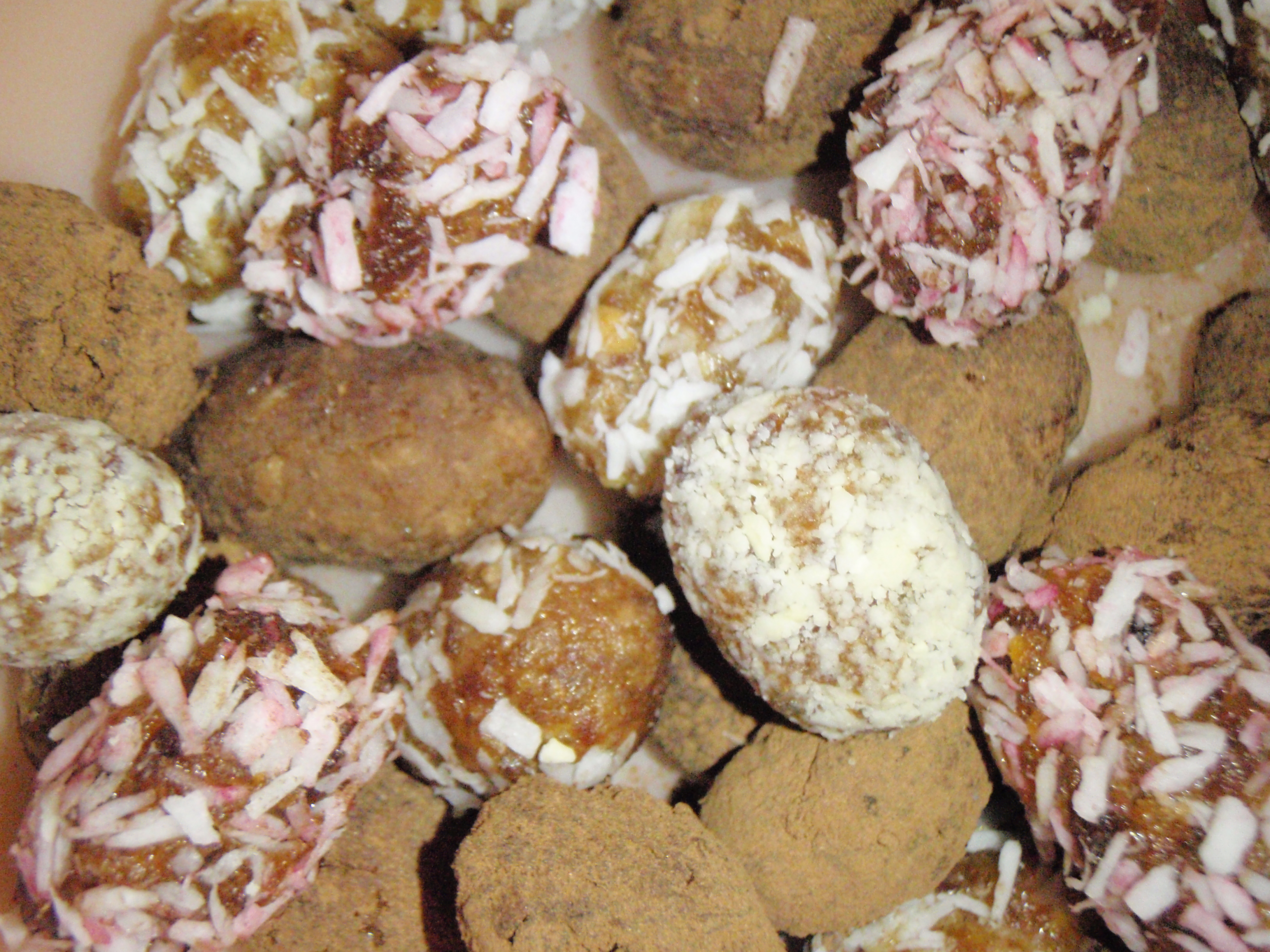 Danach habe ich sie in Karob oder – nicht ganz fettfrei – Kokosflocken (teils mit Rote Beete eingefärbt) oder Cashewmehl (dazu einfach Cashews im TROCKENEN Mixer mahlen) gerollt…das sah dann so aus: